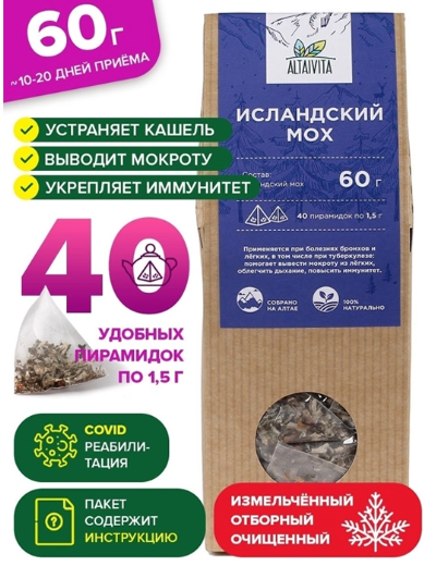 Отборный исландский мох в пирамидках - уникальный природный антибиотик, наиболее эффективный при заболеваниях верхних дыхательных путей. Исландский мох, он же цетрария, избавляет от бронхита и от кашля, выводит мокроту, а также помогает организму восстановиться после болезней. Рассыпной мох в пирамидках отлично помогает при туберкулезе, кашле, ковиде, различных воспалительных процессах и хронических инфекционных заболеваниях. Лечебная трава цетрария исландская облегчает дыхание, способствует похудению и улучшению кожи. Для мужчин травяной сбор из очищенного исландского мха ценится за противовоспалительные свойства и способность излечивать мужские заболевания. Очищающий травяной чай от кашля рекомендуется пить как курсом, так и для профилактики.