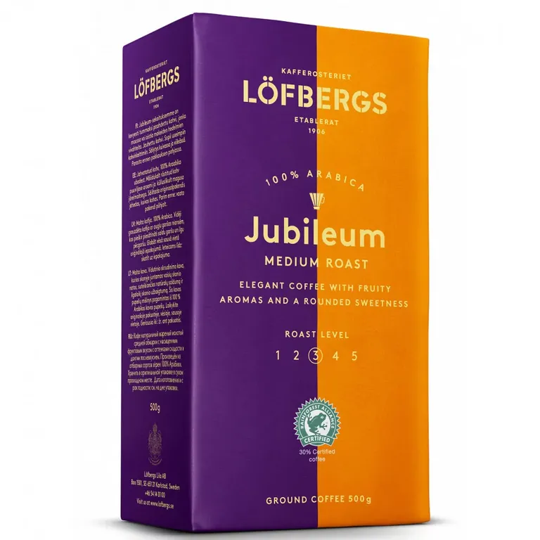 Кофе молотый Löfbergs Jubileum (Юбилейный) - кофе средней обжарки с фруктовым ароматом, который придает округлую сладость и длительное послевкусие. В этой смеси используется 100% кофе арабика из Бразилии, Центральной Америки и Восточной Африки.