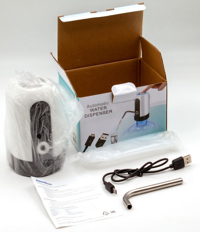 Для зарядки соедините новую помпу Aqua Work с любым зарядным устройством с разъемом micro-USB (например, от обычного смартфона) на 3-5 часов. Индикаторная лампочка-кнопка во время зарядки автоматически подсвечивается. Одной зарядки хватает на использование с 4-5 бутылями 19 литров.
