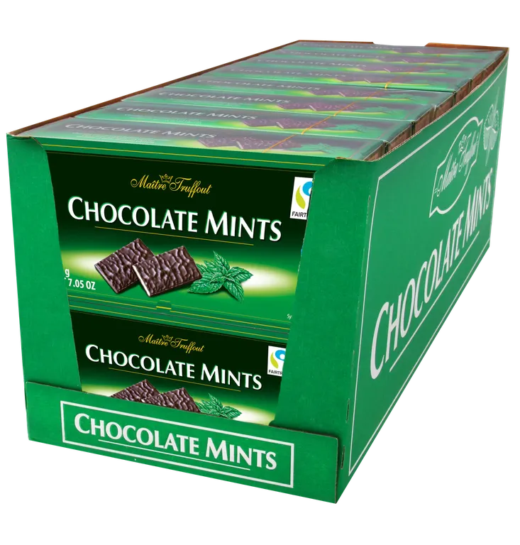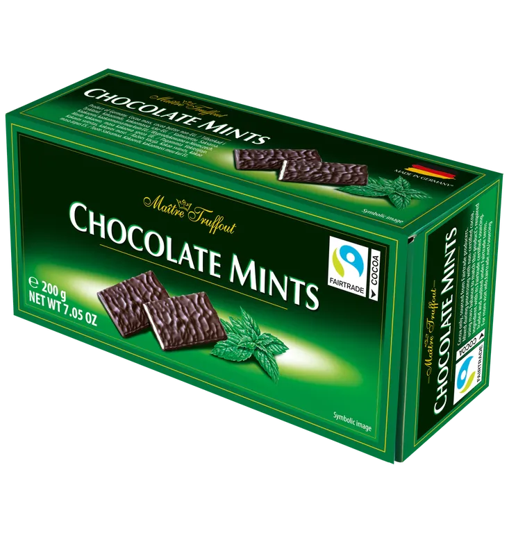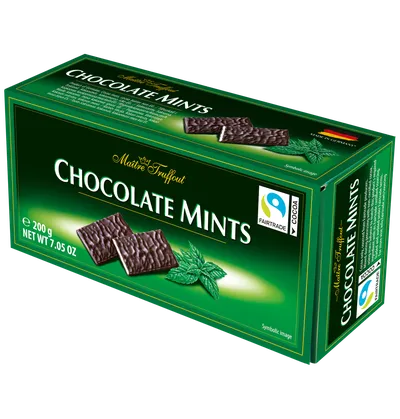 Шоколад с мятной начинкой «Chocolate Mints» — изысканное лакомство, которое не только содержит натуральные ингредиенты, но и несёт заряд хорошего настроения. Мятная начинка изготовлена из натурального масла, а нежный шоколад тает во рту. Каждая шоколадная пластинка имеет индивидуальную упаковку. Пищевая ценность: белки – 3,5 г, жиры – 17 г, углеводы – 70 г.