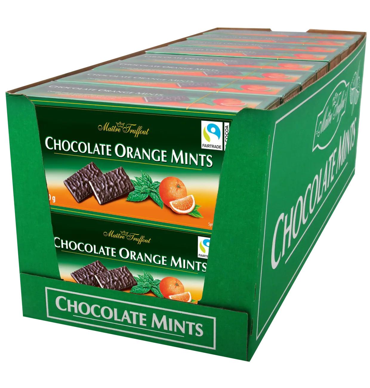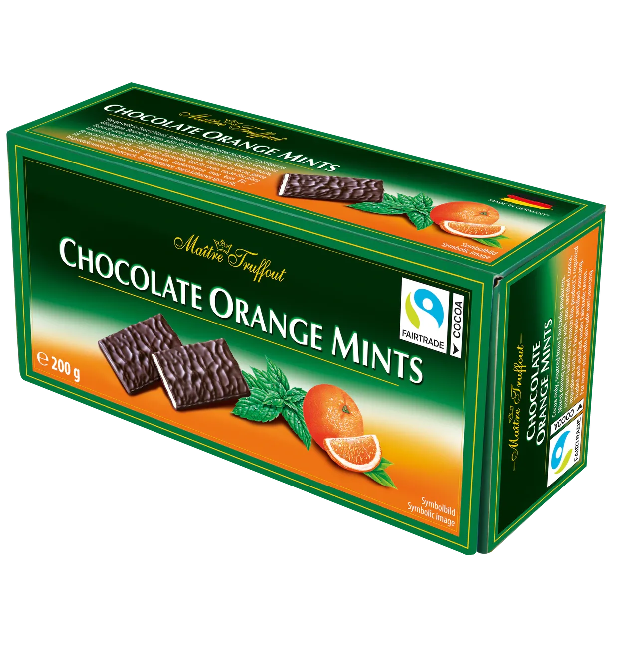 Шоколад Orange Mints - плитки темного шоколада апельсин/мята 200г. Тончайшие шоколадные листья от Maitre Truffout. Тончайший темный шоколад снаружи и помадная начинка со вкусом апельсина и мяты внутри. Благородная идея подарка на любой случай или для удовольствия.