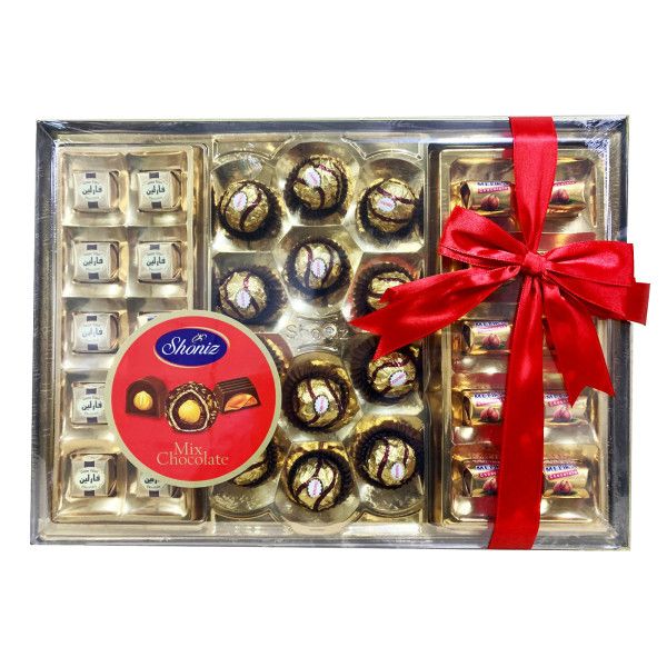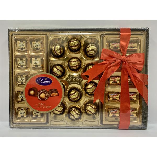 Набор конфет Шониз (Ассорти) в прозрачной пластиковой упаковке 346 г/6шт, торговой марки "Shoniz". Производство: Иран. Конфеты из натурального шоколада с начинками и без. Дополнительно в комплекте подарочный пакет с ручками. Элегантная упаковка делает этот продукт замечательным подарком на праздник.