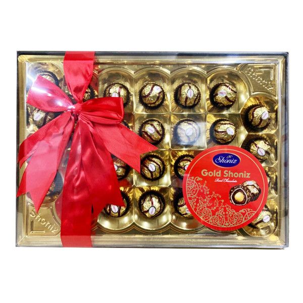 Набор конфет Шониз Голд (Ferrero) в прозрачной пластиковой упаковке 364 г/6шт, торговой марки "Shoniz". Производство: Иран. Конфеты из натурального шоколада с начинками и без. Дополнительно в комплекте подарочный пакет с ручками. Элегантная упаковка делает этот продукт замечательным подарком на праздник.